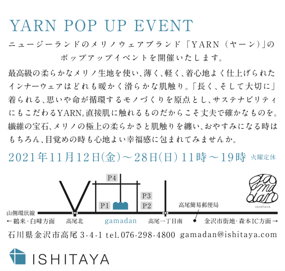 2021.10.28 POP UP のおしらせ。 石田屋(金沢) 毎年の恒例イベントです。石田屋gamadanにて幅広いコレクションをご覧いただけます。 11月12日ー28日 大正12年創業。明日のための眠りを考える寝具店「石田屋」では、天然素材の寝具をメインに扱うショップと発酵ランチを提供するdiningが併設され、広々とした気持ちの良い空間で五感を通して「心地いい」を体験いただけるスペースです。 NEWS一覧に戻る 前の記事 後の記事