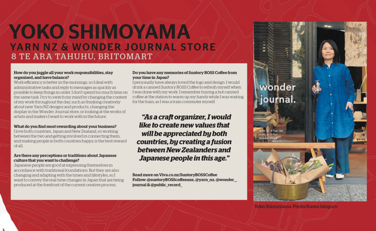 From places to pick up a Suntory Boss coffee, to spots that have that unique urban energy, we’ve been popping into some of our must-visit locations in the central city — like Britomart’s entrancing Wonder Journal store, owned by Yoko Shimoyama (who also creates premium merino label Yarn NZ, which is stocked at the store and sold in Japan). Taking a break from her busy day, Yoko graciously shared her feelings about working across two markets, staying organised, and her fond memories of Suntory BOSS Coffee.