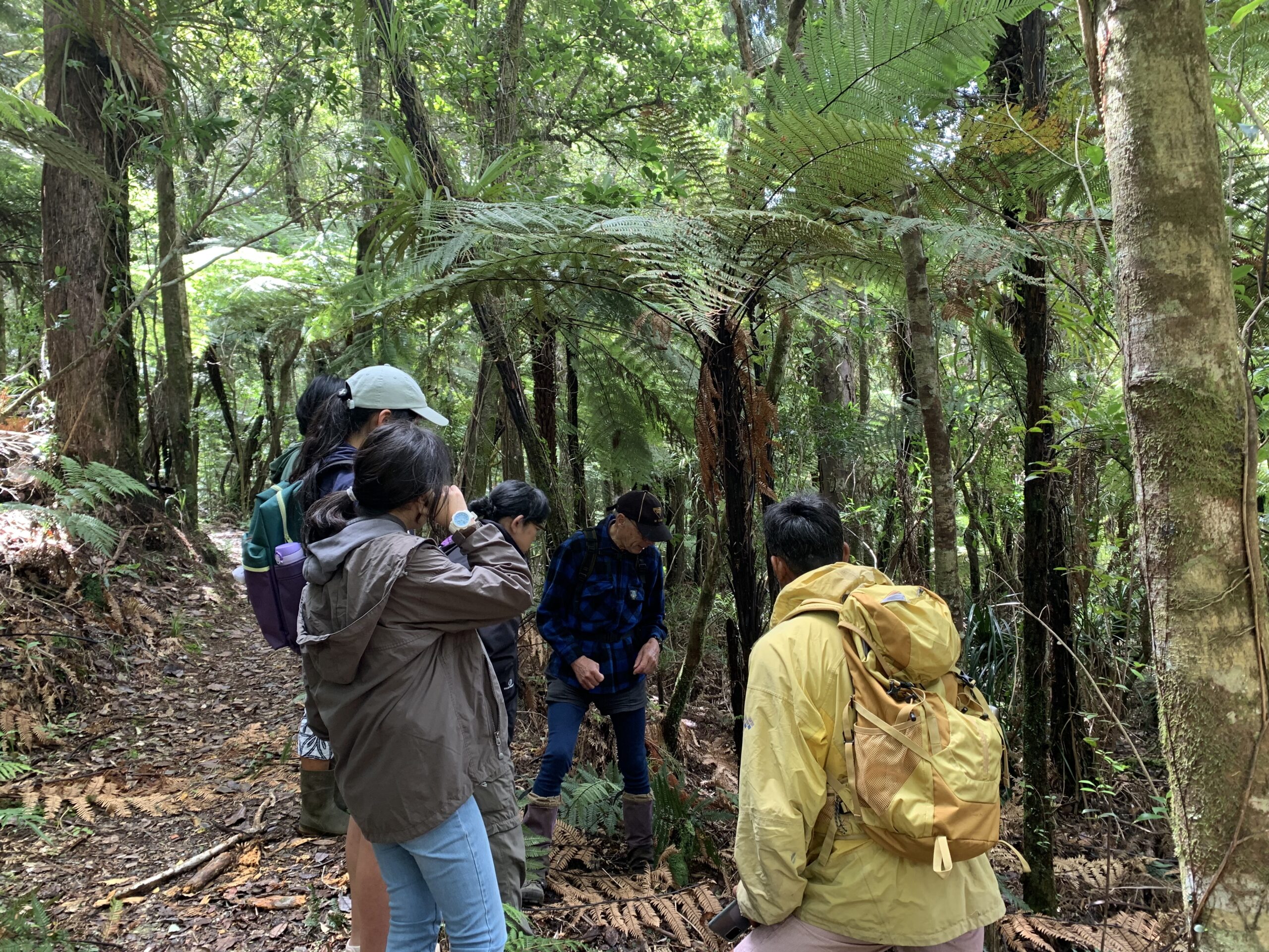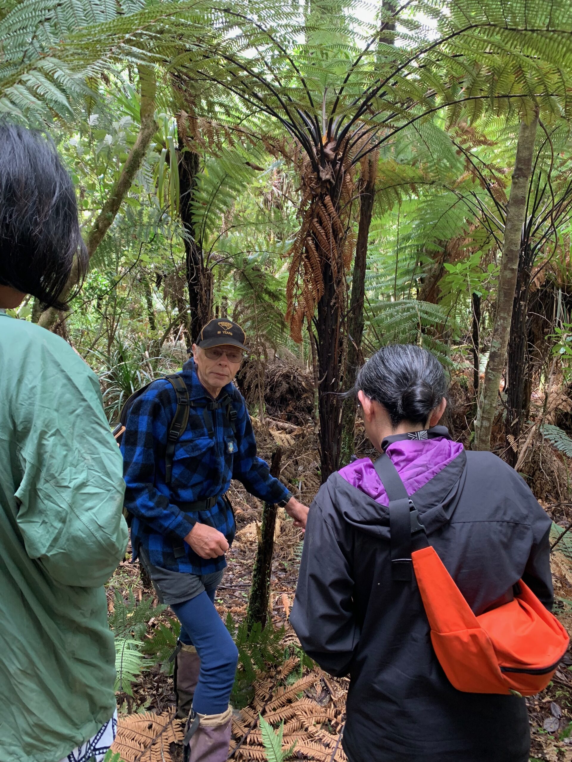 案内をしてくれたのはイアンさん、プケキの森ボランティア活動の理事の方。イアンさんはこの森のすぐ近くに住んでいて普段はファームをされています。森に入ると、珍しいとされるシダの種類やネイティブの植物や木々のお話を沢山してくださり、ボランティアによって道の途中に仕掛けた害獣の罠の説明をしてくれました。