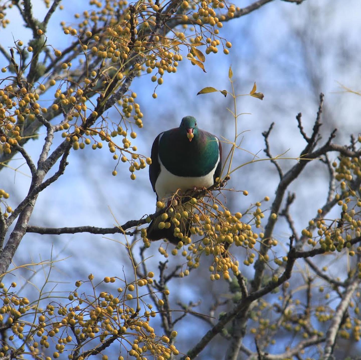 kereru(ケレル)はマオリ語で、英語名はNZ wood pigeon。その名の通り森に住む鳩です。木の実全般、特にベリー類を食べます。体が大きいので、他の鳥が食べられないような大きな実も食べることができ、NZの固有植物の実を食べ糞と一緒に種を排出することであちこちに固有植物を分布するという役割を担っている実はとても大切な鳥なのです。