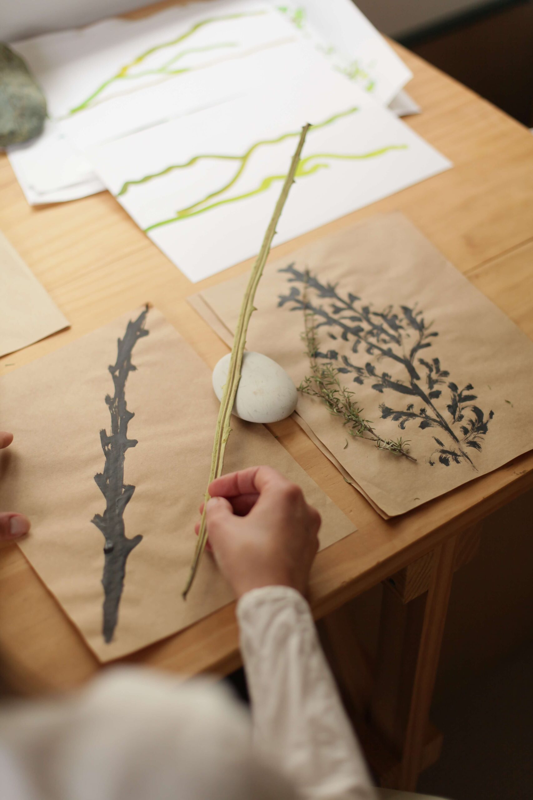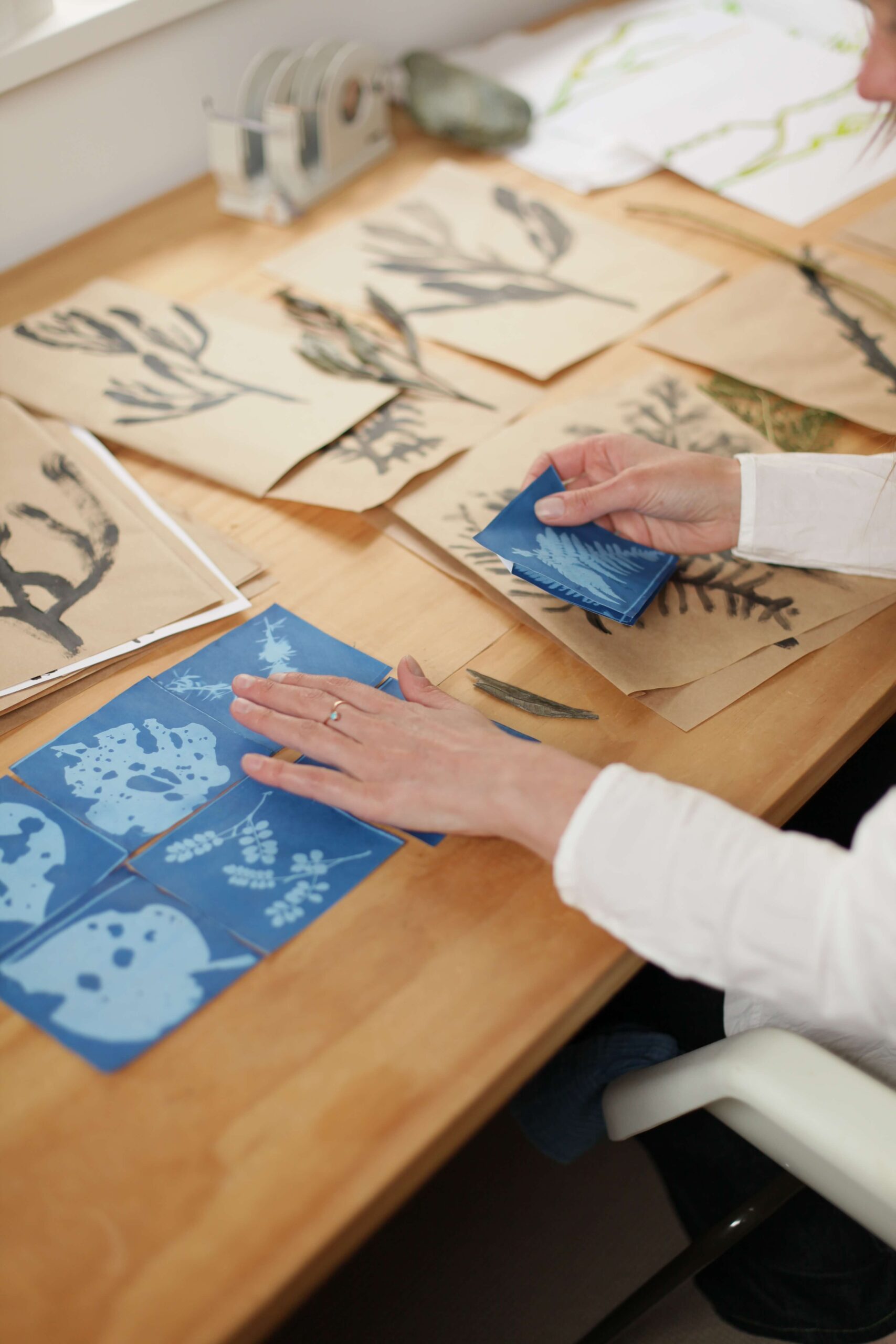 私の家の近くにはネイティブの植物が茂る小道がたくさんあります。木漏れ日(木々の間から溢れる光のダンス)の差し込む木々の中を歩くこと、これが今回のスタートポイントでした。いくつかの異なる植物のイラストのコンセプトをペイントや青写真などで作成しました。そこからヨーコが気に入ったものを選びデザインを展開していきました。最終的に、紙と墨汁を使用したジェスチュラル・ペインティングで、表現豊かなデザインにしています。マヌカ、シダ、コーウァイ、ホロエカ、アケアケ。これらは私の庭や近所で見つけたニュージーランドネイティブの植物で、私たちにとってなじみのある特別なものです。